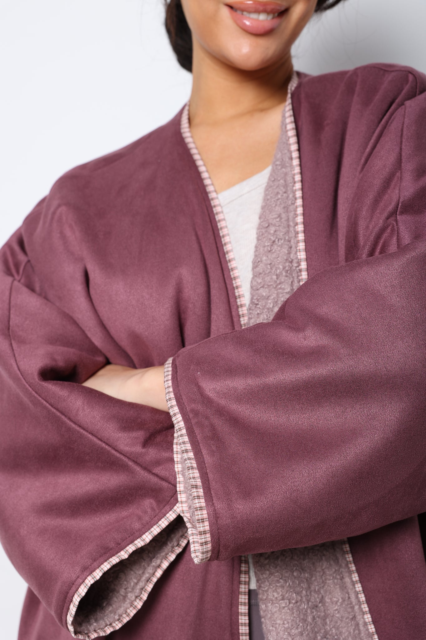 The Cozy Mantle is a suede bisht lined with sherpa and finished with a contrasting lined trim.