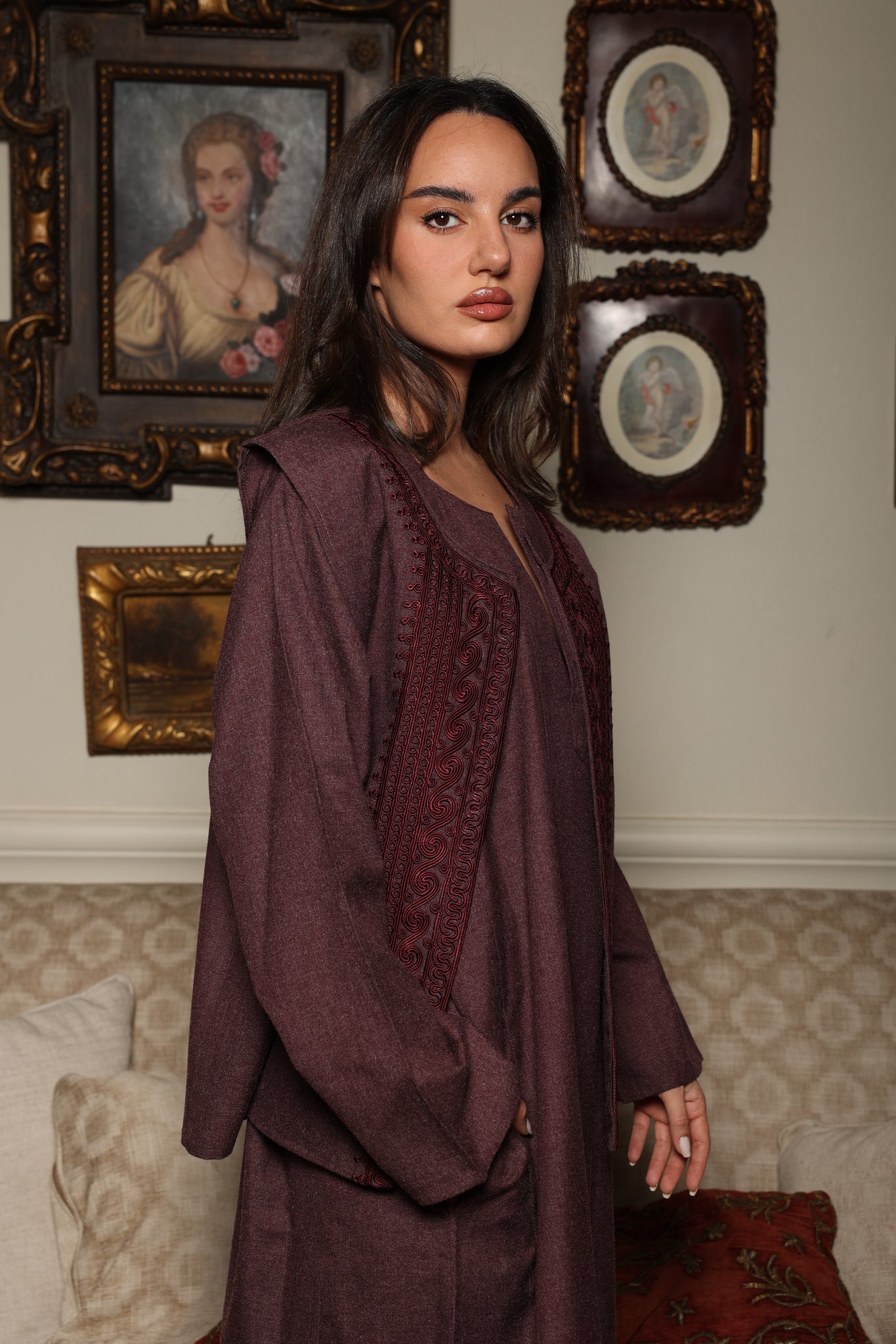 Arabesque, crafted in a deep burgundy tone, featuring a dishdasha layered with a beautifully hand-embroidered vest.