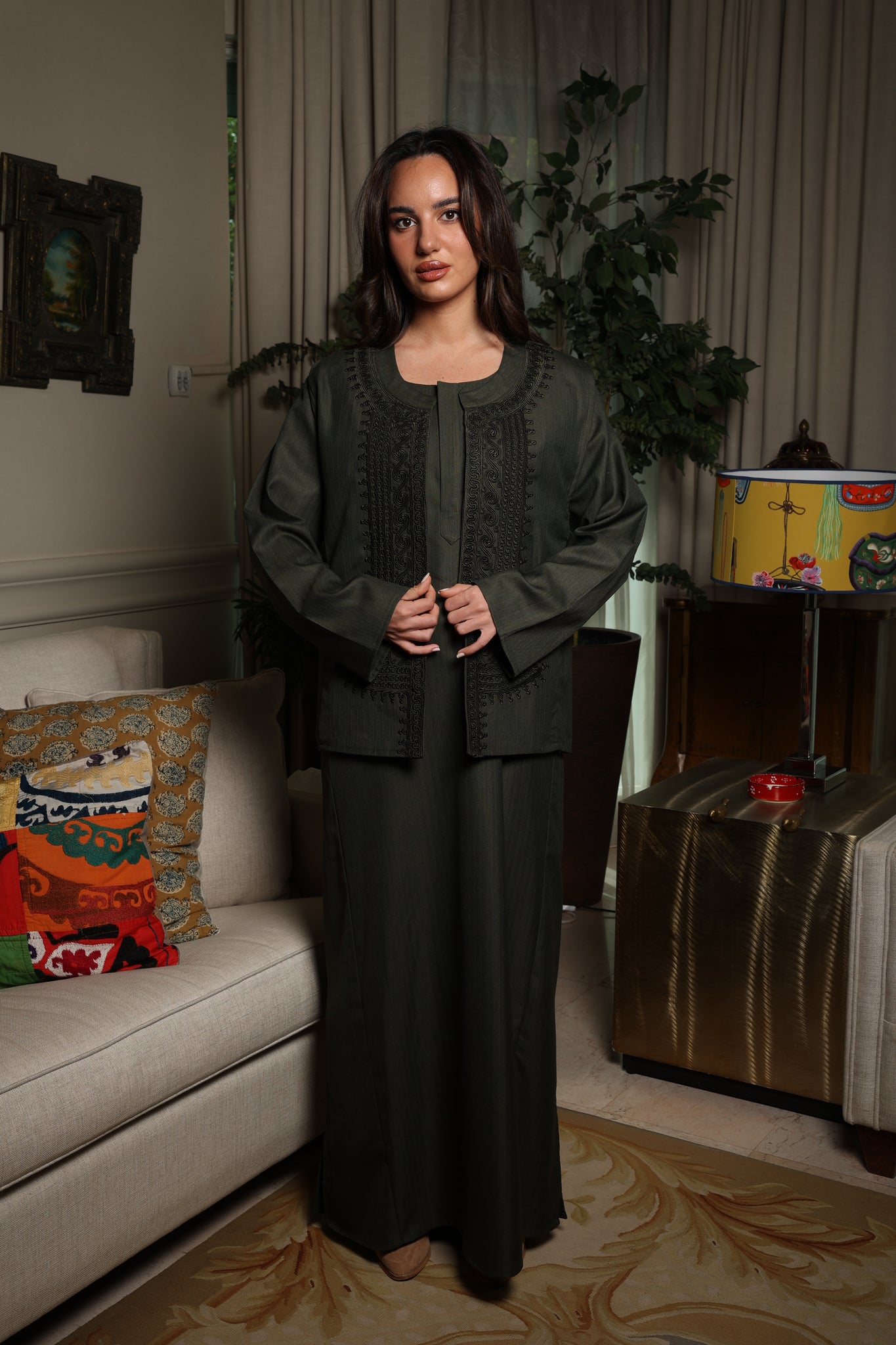 Arabesque, crafted in a deep olive tone, featuring a dishdasha layered with a beautifully hand-embroidered vest.