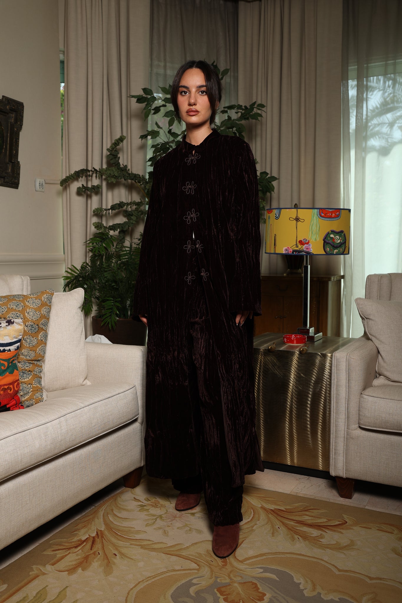 Velour is a soft velvet pants set with an easy drape and subtle button detailing.